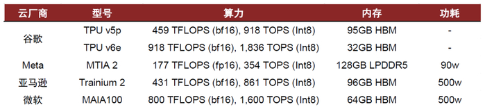 ►谷歌:谷歌自2014年起与博通合作TPU,用于数据中心训练和推理,自研AI芯片进展较快,约1-2年进行一次迭代,目前已推进至TPU v6e(Trillium)。自TPU v5起,每代芯片推出训推p和推理e两个版本。TPU v5p在bf16下可达459 TFLOPS,拥有95GB HBM;TPU v6e(Trillium)目前已推出,据谷歌,其峰值计算表现是v5e的4.7倍,能耗比相较v5e优67%。