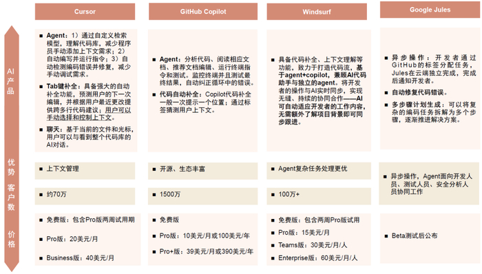 目前AI+编程场景渗透率较高,海内外科技公司程序员积极使用AI编程工具提质增效。目前讨论度较高的产品包括Cursor、GitHub Copilot、Windsurf和Google Jules。几款产品均包含基础功能:1)代码自动补全;2)自动修复代码错误;3)Agent:分析代码、理解上下文,并且将复杂问题拆解为简单问题辅助程序员。几款产品具备差异性,例如Cursor上下文管理能力较强、GitHub Copilot开源后生态更加丰富、Windsurf agent处理复杂任务更具优势、Google Jules注重异步操作。