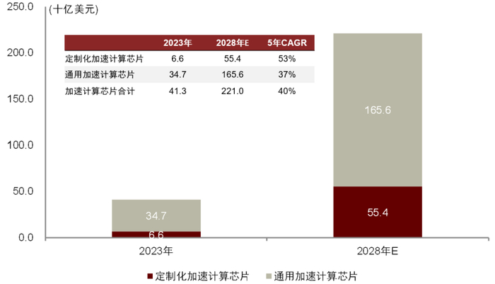 图表7:2023年和2028年定制化加速芯片与通用加速芯片市场规模