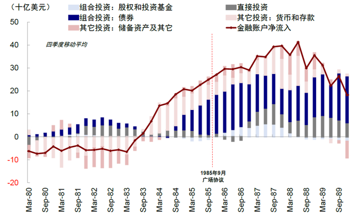 图表9:《广场协议》后美元贬值,但资金仍流入美股和直接投资,直至1987年股灾