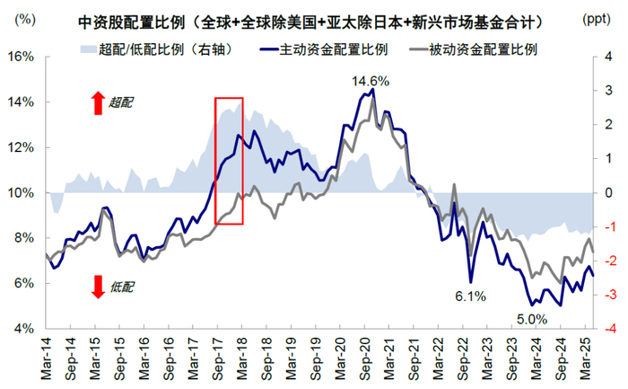 图表6:…在此期间资金流入中国,全球基金对中国配置比例明显抬升