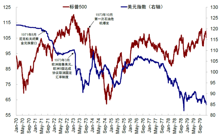 不过,当前市场的担忧显然不是货币政策或基本面因素,而更多是对长期美元信用以及安全资产地位的担忧,这也是“对等关税”后美元走弱、一度出现“股债汇三杀”的原因,这种担忧更类似1971年布雷顿森林体系解体对美元信用的冲击。回顾70年代,美元信用的轰然崩塌固然有特里芬难题下的必然,也有石油危机等偶然因素的加强。1971年8月,尼克松政府宣布关闭“黄金窗口”,停止美元与黄金挂钩,美元随之大幅下跌,从1971年8月“尼克松冲击”前的118贬至1978年低点的82。但标普500在最初的3个月下跌6%后,1971年11月再度反弹至1973年初,期间上涨33%。不过,1973年后美联储货币政策转为紧缩、欧洲9国达成协议取消固定汇率制度,叠加1973年10月中东战争爆发导致第一次石油危机,导致标普500从1973年初转为下跌,从1973年初高点到1974年10月下跌48%。