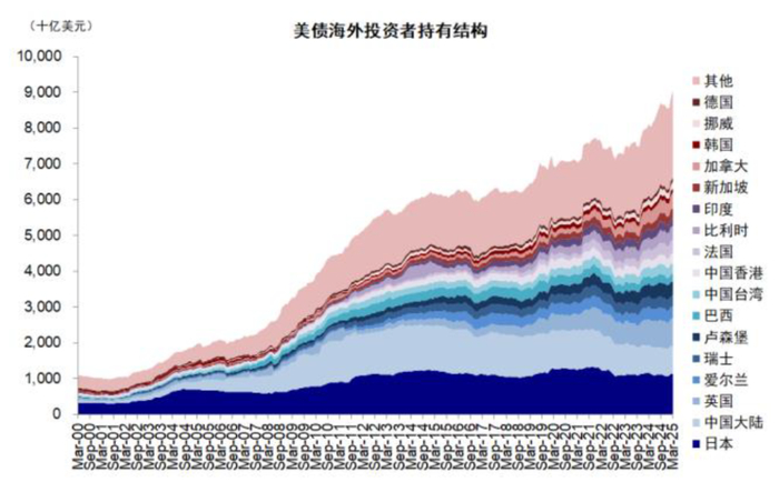 但需要指出的是,美元信用体系的变化是个长期问题,正如美元储备货币地位的形成并非一朝一夕,其动摇也并非一蹴而就。尽管当前美债的海外投资者持有意愿不如从前,日本和中国这两大美债最大的海外持有者2022年以来分别减持美债1663亿美元和2831亿美元,但36万亿美元的美债也难以在短期内找到完全的替代品,且截至2025年4月美债持有者中海外投资者仅占25.7%,大部分仍为美国国内持有。美元当前仍占世界储备货币的58%,作为全球主要储备资产的地位尚未彻底撼动,更何况目前稳定币的发展还有可能强化美元化的效果。