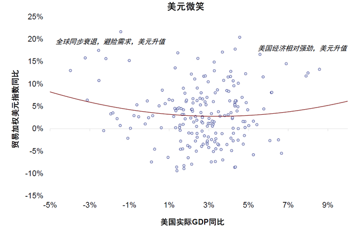 图表13:美元的“微笑曲线”显示,当美国经济强劲和全球同步衰退时美元都走强,美国经济疲软时美元走弱