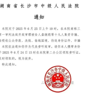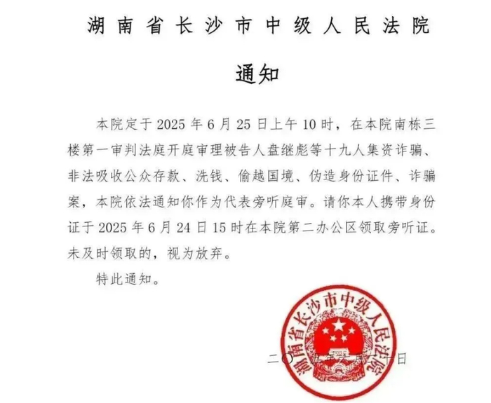 湖南省长沙市中级人民法院将于2025年6月25日开庭审理盘继彪等19人集资诈骗、非法吸收公众存款、洗钱、偷越国境、伪造身份证件、诈骗案。