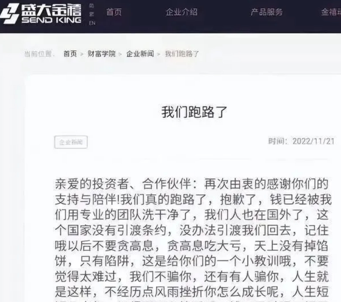 2022年11月,实控人盘继彪失联后,公司官网竟发布《我们跑路了》的挑衅公告,承认资金转移至无引渡条约国家,彻底揭开骗局。