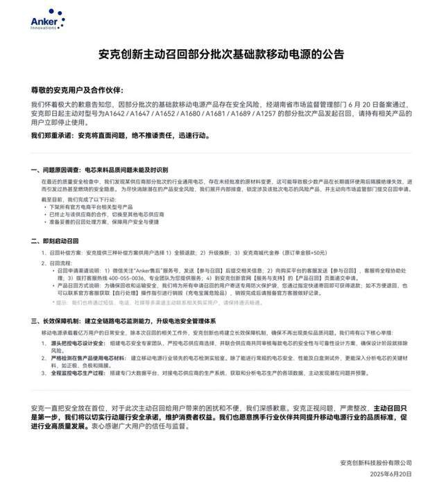 被“召回”的不止是罗马仕。今年6月13日,安克创新(anker)以“锂离子电池过热风险”为由,在美国市场召回115万台充电宝;七天后,安克又“因电芯来料品质问题”在中国市场发起召回超71万件充电宝,其在公告中称,某供应商部分批次电芯存在未经批准的原材料变更,可能导致极少数产品在多次循环使用后出现过热隐患。
