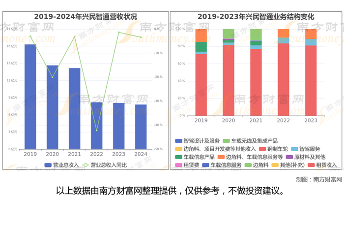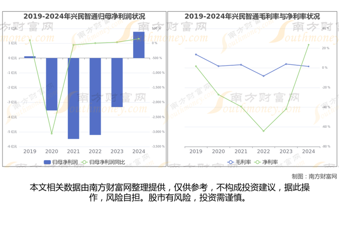 据兴民智通2024年全年业绩显示,公司营业收入为7.81亿,同比增长-3.41%,近5年复合年增长率-14.55%;净利润1.78亿,近5年复合年增长率-4.72%。公司业务结构、营业收入、归母净利润、毛利率与净利率情况如下: