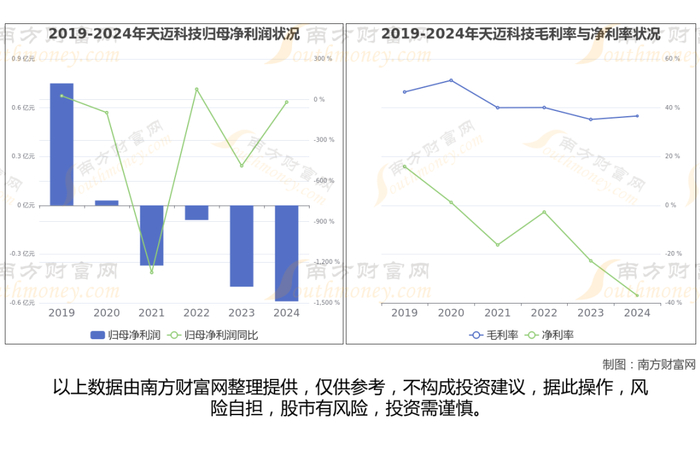 数据显示,天迈科技2024年营业收入为1.64亿,同比增长-25.61%,近5年复合年增长率-6.7%;净利润-5930.62万,近5年复合年增长率-8.06%。公司业务结构、营业收入、归母净利润、毛利率与净利率情况如下图: