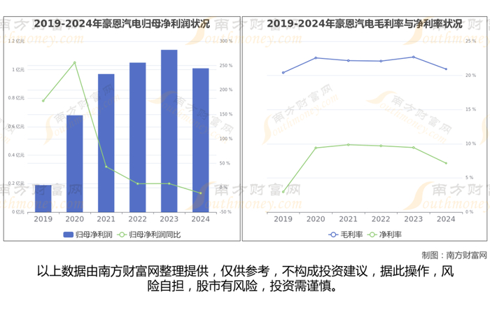 豪恩汽电财务数据显示: 2024年实现营业总收入 14.09亿,同比增长17.25%。近五年复合增长率(CAGR)为18.33%。利润: 实现净利润 1.01亿。近五年净利润CAGR为10.55%。盈利能力:毛利率为 20.93%,近五年CAGR -1.87%。公司业务结构、营业收入、归母净利润、毛利率与净利率情况如下图: