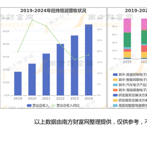 经纬恒润2024年数据显示,公司2024年营业收入为55.41亿,同比增长18.46%,近5年复合增长率为22.28%;净利润为-5.5亿,近5年复合增长为-9.98%。公司业务结构、营业收入、归母净利润、毛利率与净利率情况如下: