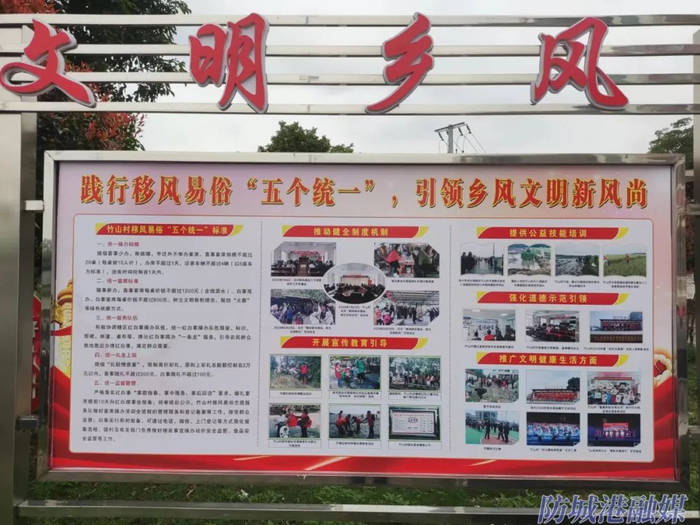 竹山村立足本村实际,为破除陈规陋习,组织村屯群众共商共议,累计发动50多名党员干部、移风易俗志愿者在竹山村4个网格18个生产小组发放移风易俗调查问卷800余份。重新修订符合村情民情的《村规民约》,并将“五个统一”标准、乡风文明等内容纳入其中。用好国门大舞台、“道德讲堂”、农家书屋等宣传阵地,以点带面,全面开展各类普惠性新时代文明实践活动。以春节、广西三月三、端午节、中秋节等传统节日为契机,通过文艺晚会、理论演讲、环境卫生清洁等方式,广泛开展建设文明乡风主题宣传活动,积极培育文明乡风、良好家风、淳朴民风,弘扬文明新风。竹山村村民莫清华说:“屋头屋角整洁了,街道干净了,近来酒席少了,礼金也少了,我们都开心了。”