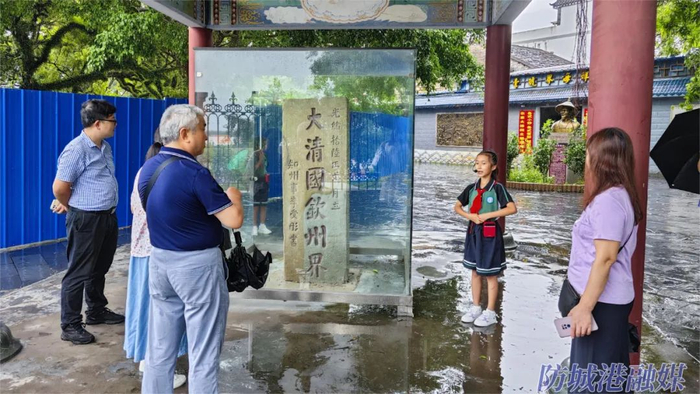 竹山村红领巾讲解员在大清国钦州界一号界碑前为游客讲解界碑知识。
