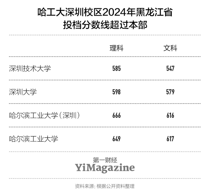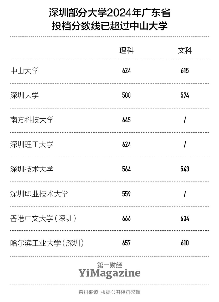 虽然截至目前,深圳仅有南方科技大学一所本地的“双一流”大学,但这些多样的尝试已经开始获得认可,标志性的两个案例是:2024年,哈尔滨工业大学深圳校区在黑龙江省的分数线超过了本部;首次招收本科生的深圳理工大学在广东省的最低投档线追平了中山大学。