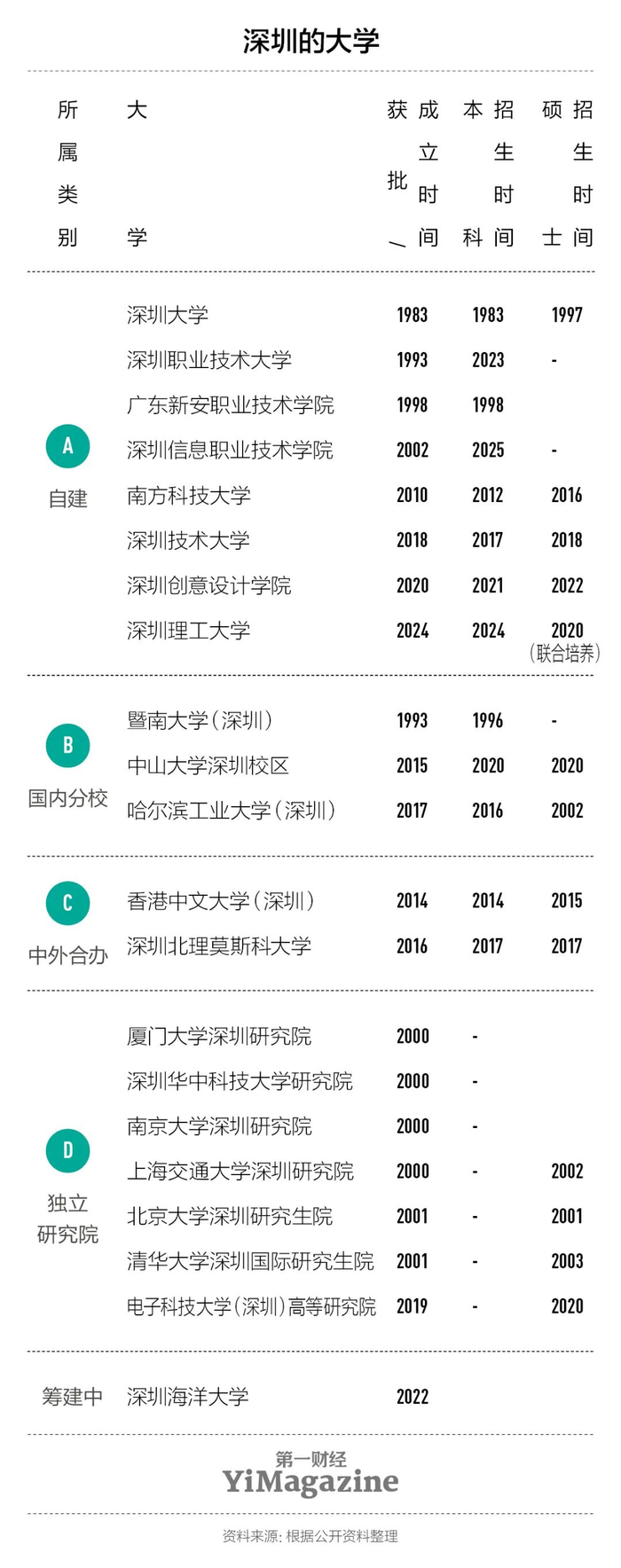2016年,深圳制定了一个10年期高等教育发展规划,此后深圳建设了8所大学。这一规划的核心数字目标——20所左右的高校、3到5所综合排名全国前50、全日制在校生25万——在2025年已基本实现。