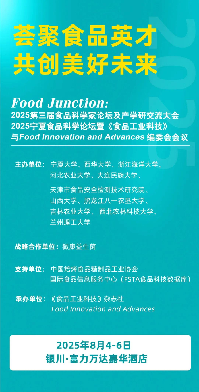 2025年8月4-6日由宁夏大学、西华大学、浙江海洋大学、河北农业大学、大连民族大学、天津市食品安全检测技术研究院、山西大学、黑龙江八一农垦大学、吉林农业大学、西北农林科技大学、兰州理工大学主办,《食品工业科技》杂志社、Food Innovation and Advances承办的“2025第三届食品科学家论坛及产学研交流大会、2025宁夏食品科学论坛暨《食品工业科技》与 Food Innovation and Advances 编委会会议”将在银川召开。本届论坛以“荟聚食品英才,共创美好未来”为主题,聚焦食品科学基础研究前沿进展与产业发展最新动态,搭建起专家学者深度交流的广阔平台,为推动行业科技创新与可持续发展提供智慧支撑。