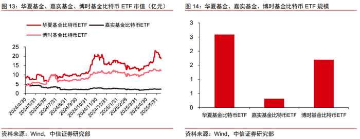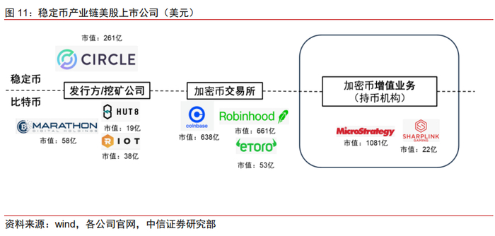 1)稳定币发行商/比特币挖矿公司:如第二大稳定币发行商Circle,发行USDC,为企业和个人提供数字金融解决方案,商业模式包括利息收入和支付与清算的手续费;如Marathon Digial(MARA)购买算力进行BTC、ETH的计算,通过出售挖出的加密货币获取收入。2)数字货币交易所:围绕稳定币、比特币、瑞波币等加密货币交易,赚取交易佣金、两融利息、提供会员等增值服务,服务对象包括散户与机构投资者。如全美第一大加密货币服务商Coinbase(COIN),市值已达785亿美元;如互联网证券经济商Robinhood(HOOD)拓展其数字货币业务,市值已达692亿美元。3)持币类:通过发行可转债等方式,筹措资金,直接购买BTC、ETH等加密货币,如微策略公司(MSTR)市值已达1032亿美元。4)比特币ETF:iShares Bitcoin Trust(IBIT)由贝莱德发行,截至2025年6月,其资产管理规模已达720亿美元。