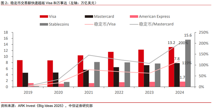 3)交易量:截至2024年末,全球稳定币总市值超2000亿美元。ARK Invest统计2024年稳定币交易额达15.6万亿美元,首次超过Visa和Master。
