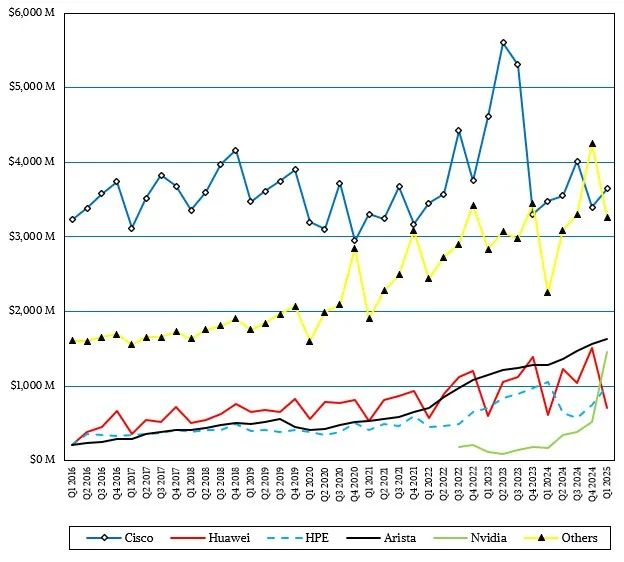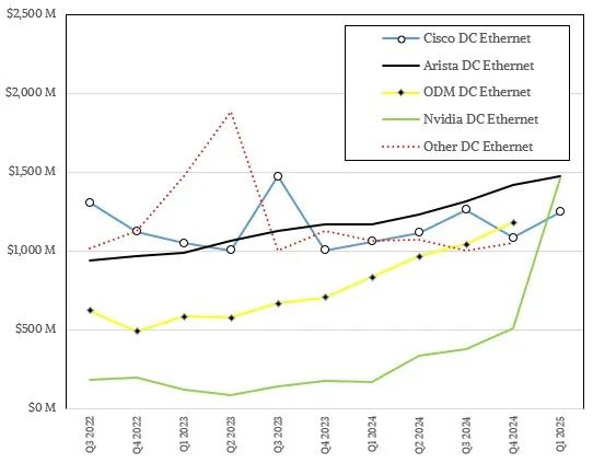2025年第一季度,Arista Networks 数据中心以太网交换机销售额达14.8亿美元,同比增长26.4%,占据数据中心业务21.3%的份额。Nvidia 紧随其后,销售额达14.6亿美元,市场份额达21.1%,其迅猛增长的势头在本文开篇有所提及。思科在数据中心领域位居第三,以太网设备销售额达12.5亿美元,在我们的模型中同比增长17.7%。正如我们之前提到的,ODM(原始设计制造商)销售额增长了67.5%,达到14.1亿美元,但同样,该领域仍有十几家公司在生产规模可观的网络设备。