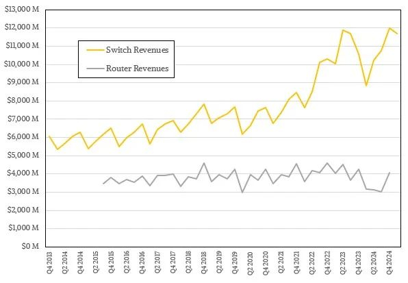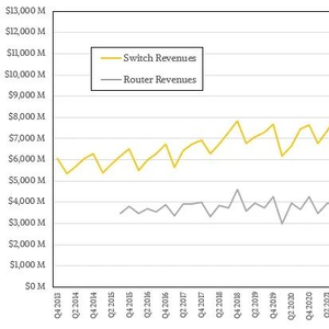 路由器市场发展缓慢,路由工作量随着时间的推移基本保持稳定,即使部分路由工作被转移到也能承担路由任务的现代交换机上——这在超大规模企业、云构建商和能够自行设计硬件和路由软件堆栈的电信运营商中很常见。其他服务提供商的规模不足以承担这样的任务,这就是为什么思科和华为技术公司仍然拥有路由硬件业务的原因。