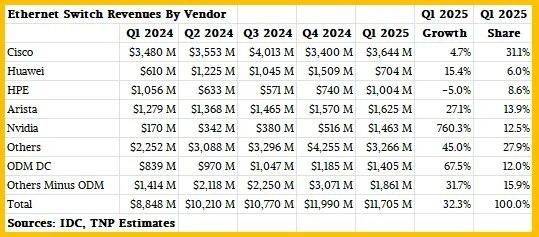 惠普企业(HPE)的以太网交换机销售额略高于410亿美元,下降了5%,这主要得益于其Aruba无线网络业务。华为的销售额为7.04亿美元,同比增长15.4%,不到2024年第四季度销售额的一半。传统上,第一季度对华为来说是一个非常疲软的季度。根据IDC的数据以及我们构建模型时已知的信息,全球原始设计制造商(ODM)——主要销售数据中心产品——共计贡献了14.1亿美元的销售额,同比增长67.5%,环比增长18.6%。