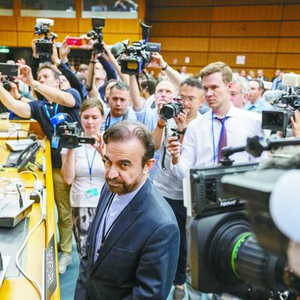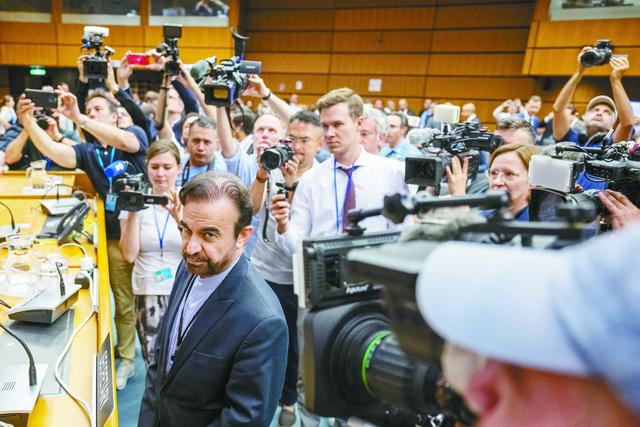 当地时间6月23日,国际原子能机构(IAEA)理事会召开紧急会议,讨论美国对伊朗核设施发动袭击后的伊朗局势。图为伊朗常驻IAEA代表纳杰菲(前排)出席会议。 (视觉中国)