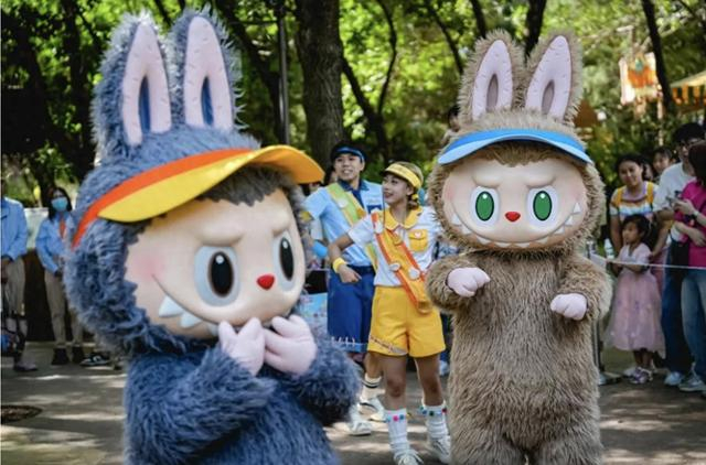 在朝阳公园泡泡玛特城市乐园,毛茸茸的拉布布偶装每天都会与游客互动。