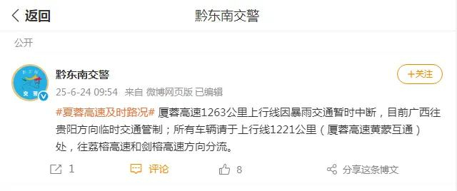 6月24日,据黔东南交警:厦蓉高速1263公里上行线因暴雨交通暂时中断,目前广西往贵阳方向临时交通管制;所有车辆请于上行线1221公里(厦蓉高速黄蒙互通)处,往荔榕高速和剑榕高速方向分流。
