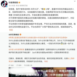 抖音表示:“经核查,账号‘姚导说体育-州济九天’、‘梅梅’,直播中均存在传播运动员八卦、拉踩等违规行为,当场直播均已被处置。回查两账号历史多次涉嫌此类违规,根据《抖音社区自律公约》,升级处置至无限期回收直播权限;