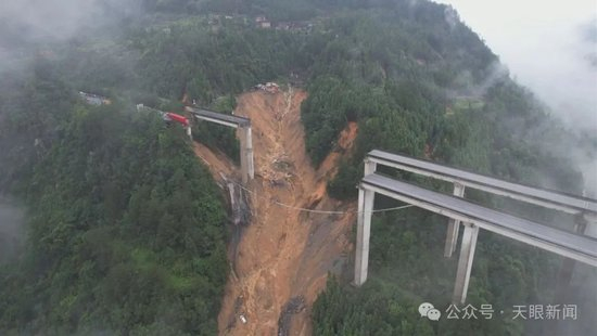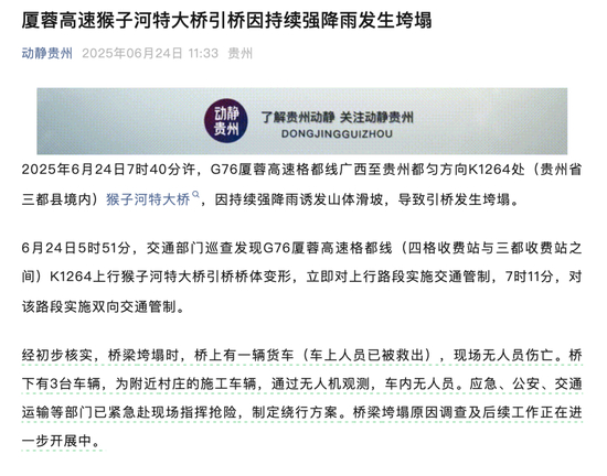 2025年6月24日7时40分许,G76厦蓉高速格都线广西至贵州都匀方向K1264处(贵州省三都县境内)猴子河特大桥,因持续强降雨诱发山体滑坡,导致引桥发生垮塌。