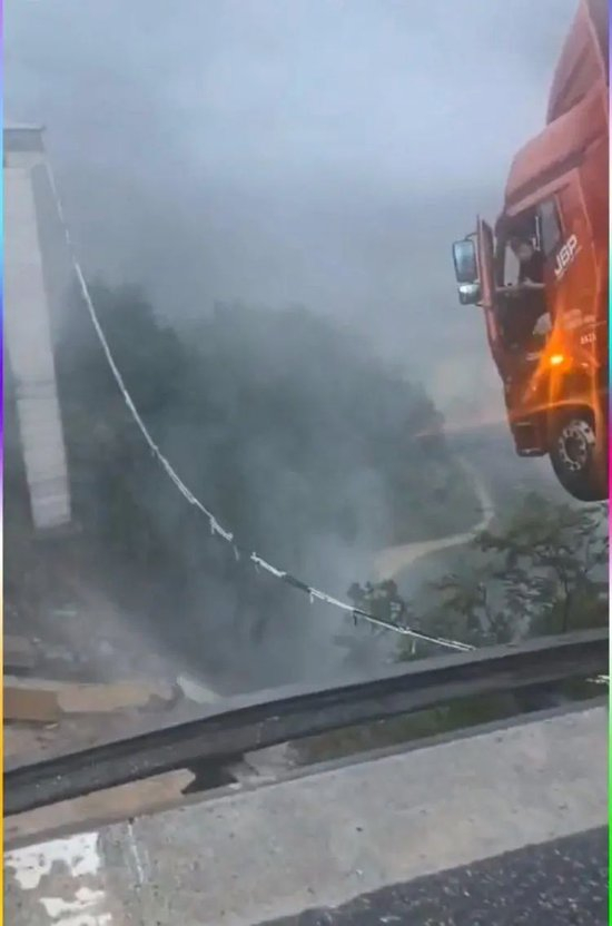 此前网传视频显示,有货车及时停车,但车头已经悬空。