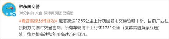 6月24日,据黔东南交警,厦蓉高速1263公里上行线因暴雨交通暂时中断。
