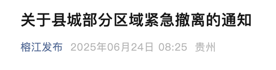 6月24日上午,贵州榕江县防汛抗旱指挥部发布《关于县城部分区域紧急撤离的通知》。该通知指出,受持续强降雨及上游来水叠加影响,榕江县防汛形势异常严峻。