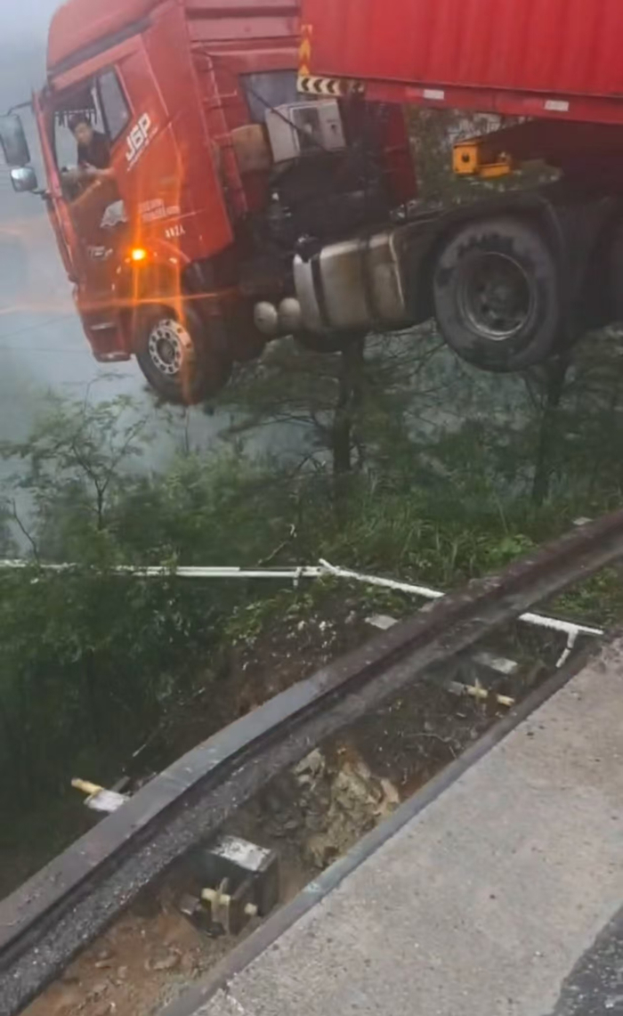 网友发的视频显示,一红色货车车头已经腾空,车身还留在路面,货车司机尚待在车头。路上的人对司机喊“你命大啊危险啊!只能等消防来啊!没信号!”桥下有几辆小车,疑似系桥梁倒塌时坠落。记者注意到,现场正在下雨。