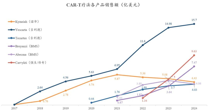 全球首款CAR-T疗法是诺华Kymriah,于2017年8月获批,随后10月,吉利德Yescarta(阿基仑赛)上市,二者开启了CAR-T疗法商业化元年。