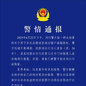 上海警方:袁某(男,26岁)多次在楼道偷窥住户隐私,行拘!
