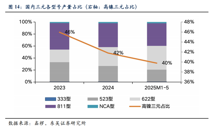 中镍高电压份额持续提升,并且市场需求往6系材料转移。中镍高电压凭借性价比与安全性优势实现快速增长,其中6系材料24年产量占比达32%,同比大幅提升11pct,25年1-5月占比进一步提升至40%,而5系份额受到挤压,24年产量占比同减6pct至26%,25年1-5月降至20%。高镍三元24年产量占比同减4pct至42%,25年1-5月小幅下滑至40%,海外市场仍以高镍路线为核心。