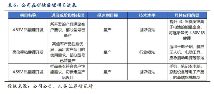 公司具备独家技术优势,性能指标持续领先,锁定客户未来2-3年份额。当前市场中钴酸锂交付仍以4.45V产品为主,4.5V及以上产品仅极少数公司可生产,公司通过优化前驱体四氧化三钴控制结晶法生产工艺、掺杂包覆等技术及工艺,提升产品性能和质量,在高电压、高能量密度等方面保持领先,当前4.53V 钴酸锂产品通过多家客户认证,实现小批量供货;4.55V 产品开发进度符合客户要求,性能指标领先同行,将逐步替代4.5V及以下产品,高电压趋势下锁定客户未来2-3年份额,市占率持续提升。