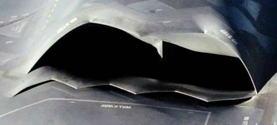 冷空气被吸入B-2发动机进气口下方的缝隙,与热废气混合。