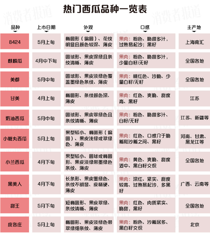 为了让消费者能够轻松找到心仪的西瓜品种,《消费者报道》记者精心整理了以下10人气款西瓜的口感特点与外观形状,供各位参考。无论您是偏爱清脆爽口的类型,还是钟情于沙糯多汁的口感,这份清单都能满足您的需求,助您快速锁定心仪的西瓜。