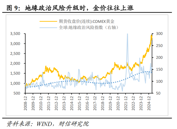 二是全球秩序重构下,地缘冲突长期存在,持续提升黄金避险价值。与以往两轮黄金牛市不同的是,过去两轮牛市都处于世界经济全球化浪潮中,地缘冲突呈散点偶发状态,而当前世界正处于逆全球化进程中,地缘冲突呈现长期化、复杂化特征,显著强化黄金的避险属性。其一,俄乌冲突远未结束,且存在恶化可能性。俄乌战争进入第三年,虽然美国已作为调解者强势介入冲突谈判,但俄乌乃至俄欧双方矛盾将长期存在,俄欧关系不可能发生根本性改变,且为维护北约稳定性,德国已经公开介入并支持乌克兰,未来俄乌战争面临再度升级甚至蔓延至北约各国的可能性。其二,中东乱局将长期存在,其复杂性不仅在于地区内部力量的碎片化,还叠加了外部的大国博弈。一方面,以色列、伊朗、沙特、土耳其等国各有战略诉求,而非国家行为体的崛起(如真主党、胡塞武装)进一步削弱了传统的国家主导格局;与此同时,美国、俄罗斯等大国的介入使得中东成为全球博弈的缩影。其三,中美竞争升级。美国对中国的围堵持续加码,从金融制裁、科技封锁、贸易战到拉拢盟友进行联合遏制,美对中的遏制并非短期政策,中美关系不排除将从经济、竞争转变到系统性对抗的可能。