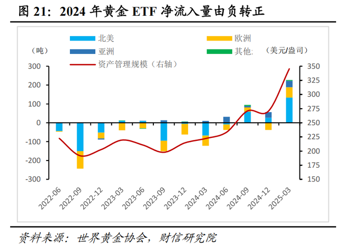 二是投资者也在寻求贵金属行业的投资机会。受地缘政治不确定性加剧、利率走势预期变化以及美元信用体系削弱的影响,2024年黄金ETF净流入由负转正。其中,亚洲国家为主要增持者,2024年全年总计净流入78.4吨,且近年来购金规模持续处于净流出状态的西方投资者重新进入黄金市场,也给金价上涨带来新动力(见图21)。