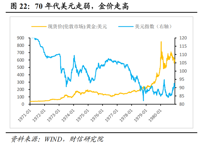 一是20世纪70-80年代,黄金价格经历了长达十年的超级大牛市,期间最大涨幅达2346%。此轮牛市背后有以下三大核心因素共同发力:其一,布雷顿森林体系解体与黄金定价自由化。布雷顿森林体系解体前,黄金价格长期被固定在35美元/盎司,这种固定价格机制使得黄金价不能自由地反映其真实价值。解体后,官方金价虽然在名义上被调整至38美元(1972年)和42.22美元(1973年),但仍有所低估,市场机制开始推升金价走高以反映其内在的真实价值。其二,美元指数走弱与实际利率下行。70年代美元指数整体走弱且实际利率震荡下行,为对冲美元贬值风险,投资者纷纷转向黄金,推动黄金价格上升(见图22)。这一过程可分为两个关键阶段:第一阶段(1971年年底-1973年年初)。1971年年底,《史密斯协定》签订,美元对黄金贬值7.89%,同时调整汇率平价,美元指数累计跌幅达-22%。与此同时,美债实际利率也由高点3.34%下降8个百分点至-4.70%。第二阶段(1976年-1980年)。1976年年初,牙买加体系建立,美元失去了黄金这一坚实后盾,其国际信用地位下降,美元指数从1976年8月的阶段高点106.7快速下跌至84.2,累计跌幅达-21%。同一时期,美债实际利率也由2.25%下降6个百分点至-4.21%。其三,能源危机与通胀压力。70年代两次能源危机冲击使得以石油为代表的大宗商品面临供需失衡格局,能源价格大幅上涨。同时美国在越南战争中的巨额开支以及国内经济问题导致大规模财政赤字,美国乃至全球普遍陷入高通胀甚至“滞胀”困境,这极大提升了黄金作为风险对冲工具的吸引力,推动金价上涨(见图23)。
