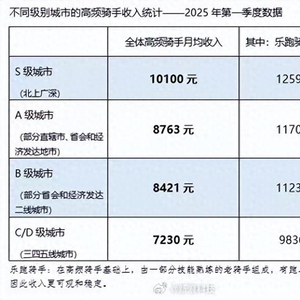 美团2025年第一季度财报显示,全国高频骑手月均收入区间为7230元至10100元,其中由熟练骑手组成的乐跑骑手收入表现突出——在北上广深等S级城市,乐跑骑手月均收入达12593元,较全体高频骑手收入上限高出24.7%。这一数据揭示了新就业形态下骑手群体的收入分层特征,也展现了平台对熟练骑手的激励机制。