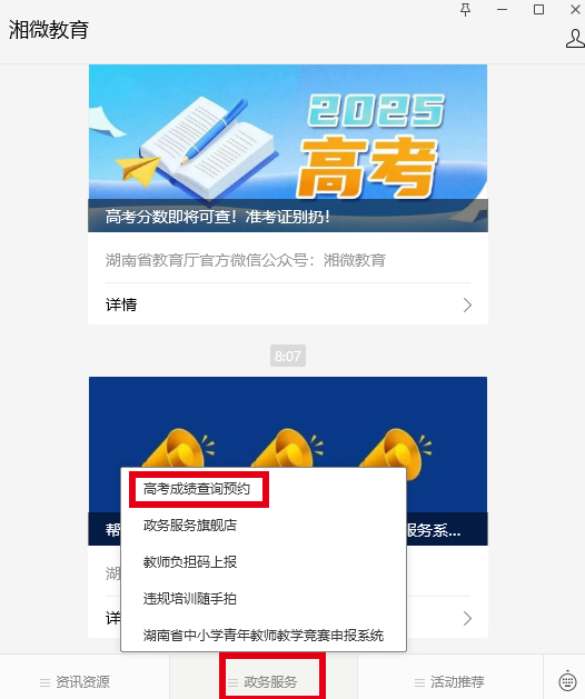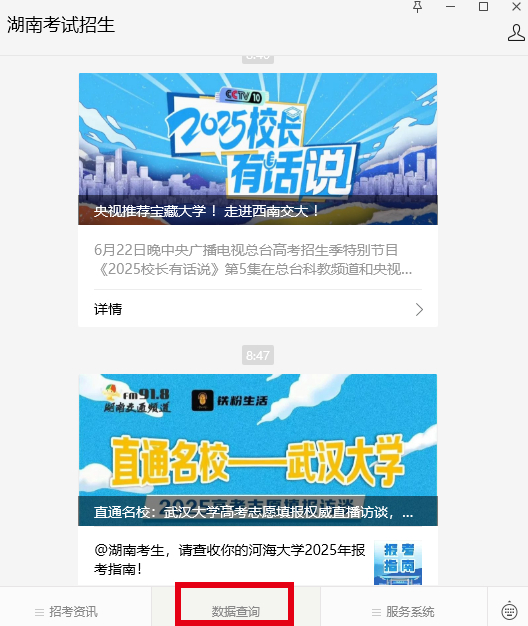 湖南高考生注意啦!湖南高考成绩将在6月25日前揭晓。6月26日起,考生正式填报各批次志愿;7月8日至8月20日,高校进行招生录取工作。为给广大考生和家长提供优质、贴心的服务,时刻新闻总结以下几个渠道查询2025年湖南高考成绩、高考志愿政策及高考录取状态。一、登录时刻新闻APP查询时刻新闻客户端开通高考成绩查询服务,考生和家长只需进入时刻新闻客户端的头条频道,点击“2025湖南高考成绩查询”,输入考生号/身份证号,密码和验证码,便可查到高考成绩。(戳这里可直接进入查分页面)二、微信公众号查询微信搜索公众号“湘微教育”“湖南考试招生”,点击【高考成绩查询预约】,输入姓名/考生号/身份证号/“潇湘高考”app绑定的手机号码后六位等完成认证,登录之后即可查看分数。
