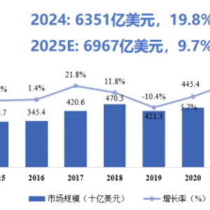 当前,大模型参数数量大、训练数据量大、模型复杂度高等特征对计算资源需求不断加强,高性能计算能力、大量存储空间、快速信息传输成为大模型训练和运行的计算核心要素,加大了对高性能半导体产品需求。存储器价格受市场需求刺激影响下从低位逐渐回升,销量开始释放,实现量价齐升。2024年全球半导体市场规模达到6351亿美元,同比增长19.8%。受美国新的关税政策影响,预计2025年全球半导体市场规模将提升到6967亿美元,同比增长9.7%。