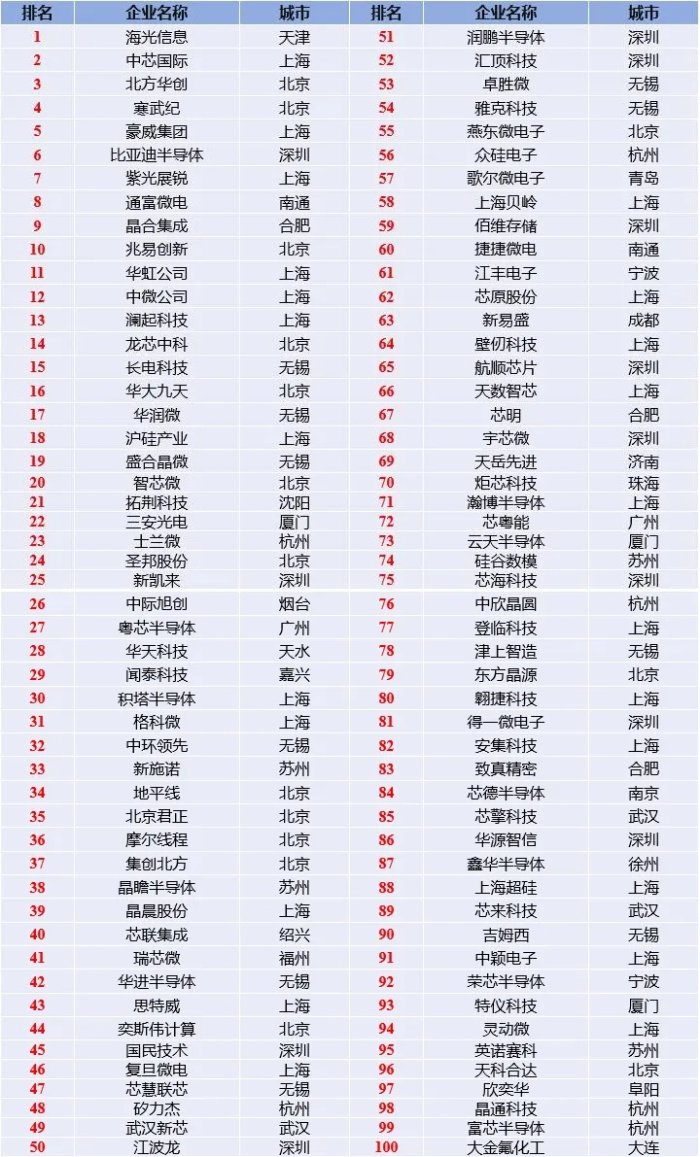 综合结果显示,海光信息、中芯国际、北方华创、寒武纪、豪威集团、比亚迪半导体、紫光展锐、通富微电、晶合集成、兆易创新位列2025中国集成电路创新百强企业前十位。