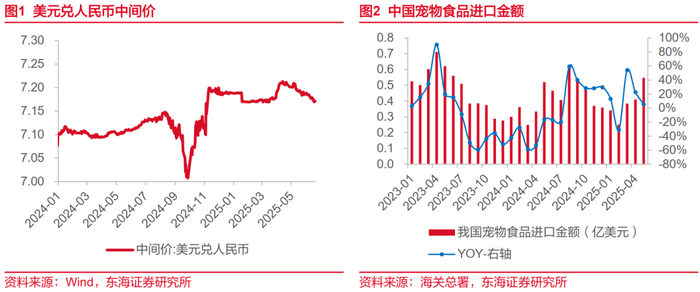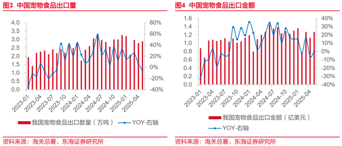 受关税政策扰动5月宠物食品进出口波动。2025年5月宠物食品出口量受关税扰动同比下滑,出口金额同比微降。根据海关总署,2025年5月我国宠物食品出口量为2.89万吨,同比-5.5%,1-5月累计出口量13.91万吨,同比+10.9%;5月出口金额1.27亿美元,同比-0.4%,1-5月出口金额累计5.81亿美元,同比+4.6%。2023年四季度以来,随着海外去库存结束,出口订单好转,我国宠物食品出口恢复增长,今年二季度以来受关税扰动出口有所波动。进口方面,5月宠物食品进口金额0.55亿美元,同比+5.5%,1-5月进口金额累计1.93亿美元,同比+9.5%。5月进口额增速放缓,随着中美贸易战的缓和,预计进口金额波动将逐步平稳。