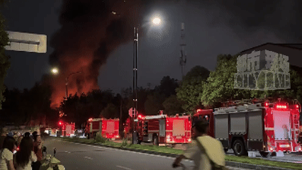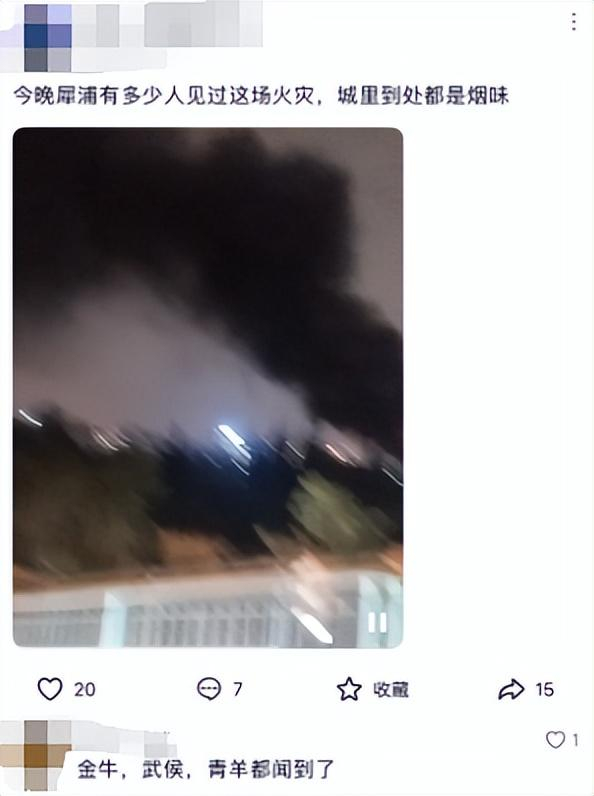 视频画面显示,多辆消防车已到达现场。网友表示,起火后烟像一朵大乌云般笼罩,半边天都是红色跟黑色,城里到处都是烟味,附近区域的居民都闻到了。