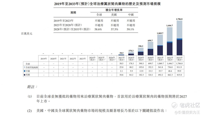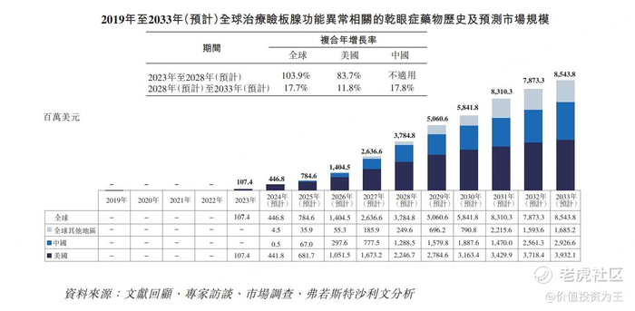 但是,根据根据弗若斯特沙利文报告,预计2027年全球治疗翼状胬肉药物的市场规模为零,2028年为178.3百万美元,2033年才能达到1,786.8百万美元: